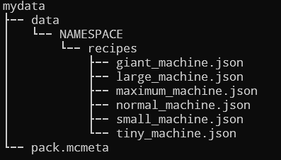 }Once you have a basic datapack structure, you can now follow the recipe specification to add any recipes you like (not just Compact Crafting recipes, either!). For that, go to the Recipe Specification page. In short, create a new file called myrecipe.json (name it something unique) and place it under recipes in the pack structure above.