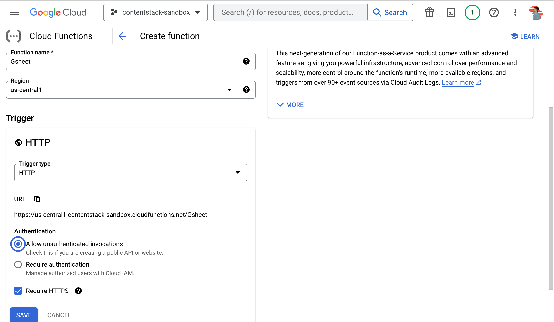 - The next step is to select "Trigger" as "HTTP" and Select Authentication as "Allow unauthenticated invocations".