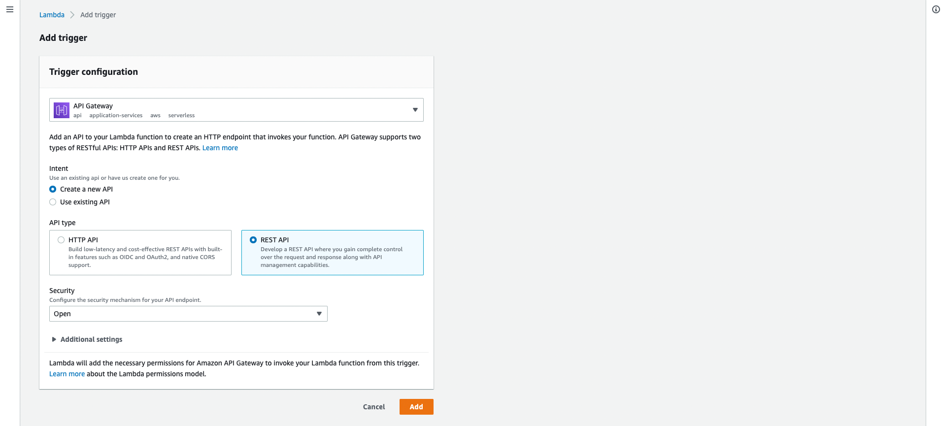- the next step is to "Select a source" as "API Gateway" after that in the "Intent" select "Create a new API", after that select "API type" as "REST API" after that select "Security" as "open".