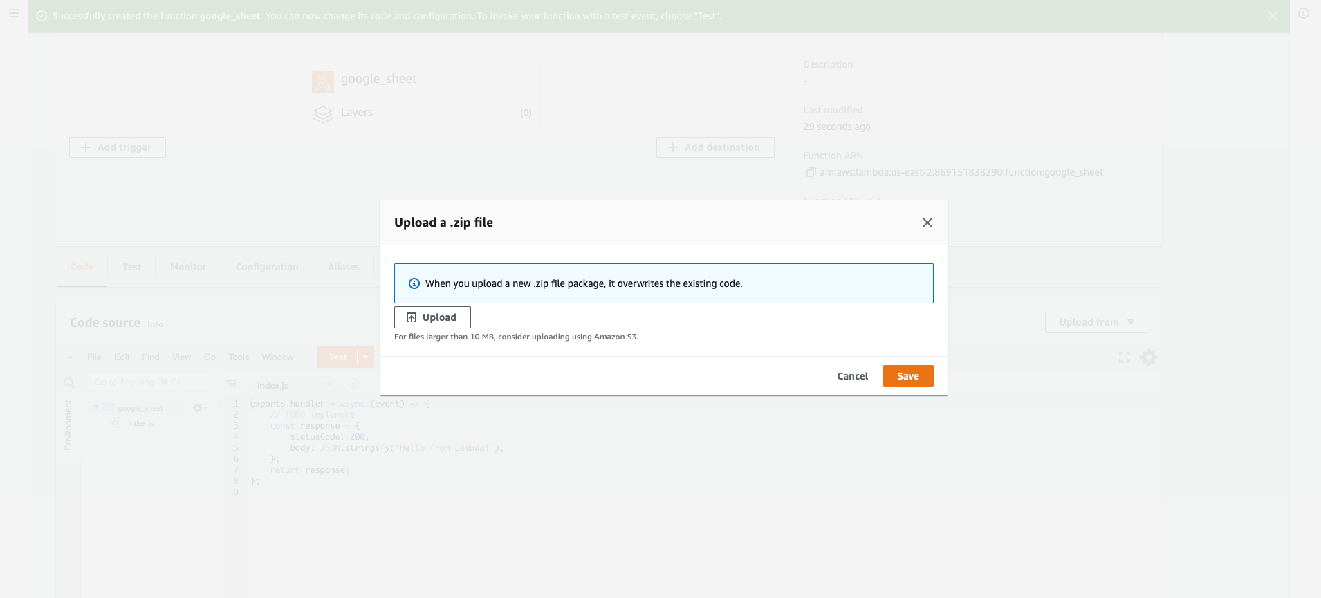Following which, a zip file called "lambda.zip" will be created in the root directory.