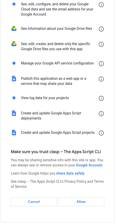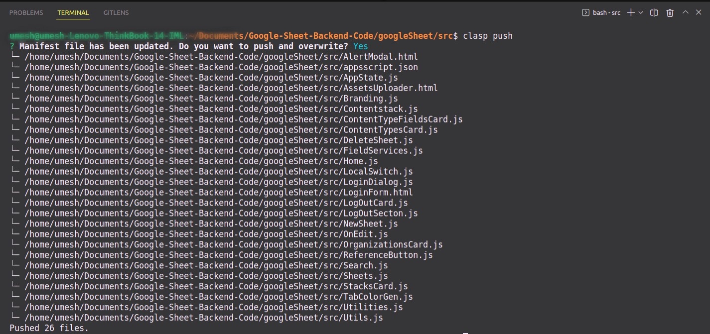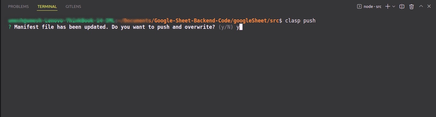 Now, we need to push the code on the previously created App Script Project. For this, use the following command. Executing this command will prompt the following question. type ’y’ to proceed.