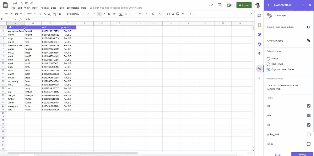 - When you create an entry in the sheet, don't add blank cells to the sheet. If you add a blank cell in the sheet, it will create a new entry, because the title field is not required in Contentstack.