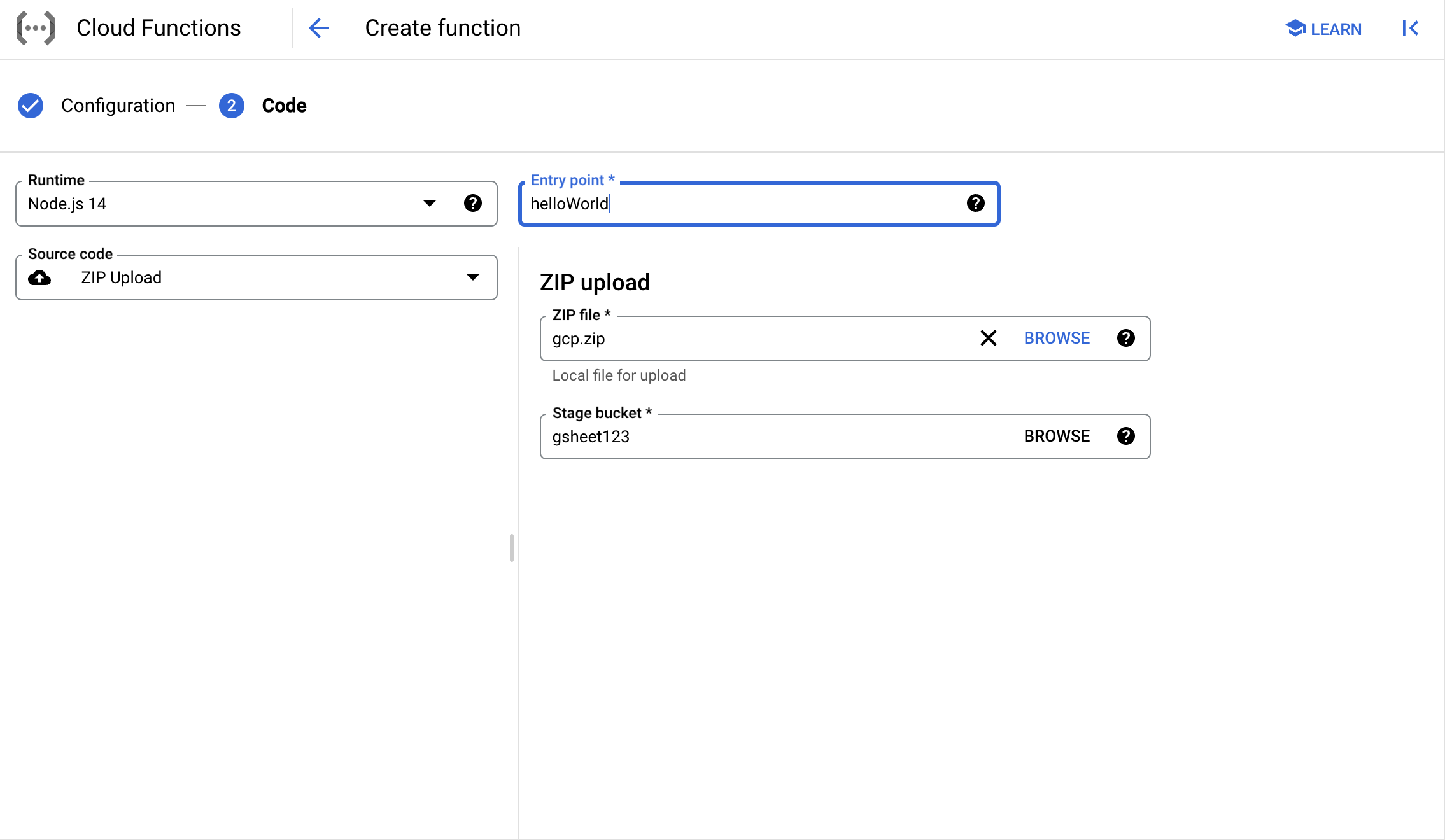 - The next step is to select "runtime" as "Node.js 14x" and then Select "ZIP Upload" in source code, after that name Entry point function as "helloWorld", in ZIP uploade select zip file and select stage bucket.