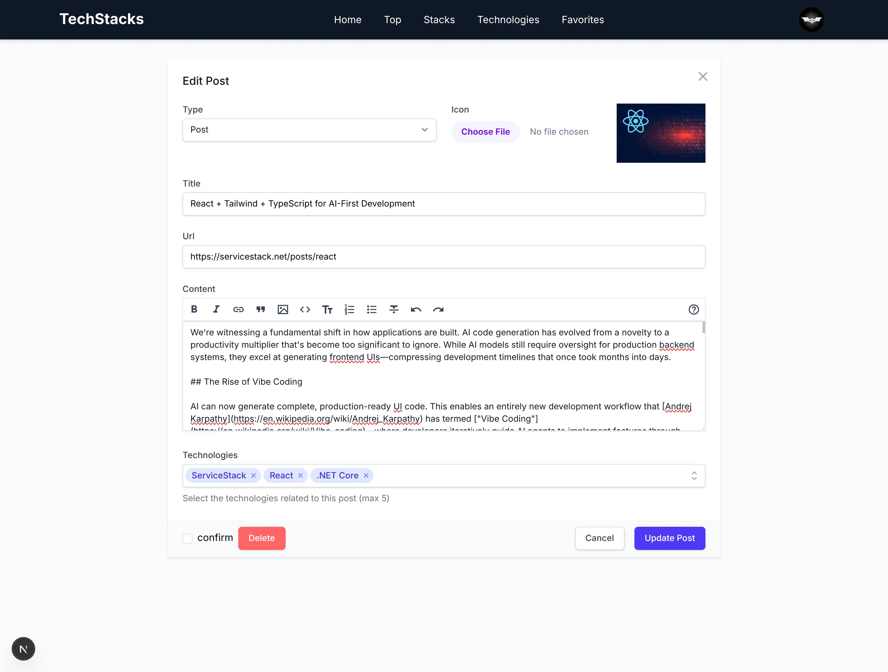 This stack represents the sweet spot where AI models have the most training data, the clearest patterns, and the best ability to generate cohesive, loosely coupled, high-quality code, and what was used for the new techstacks.io.
