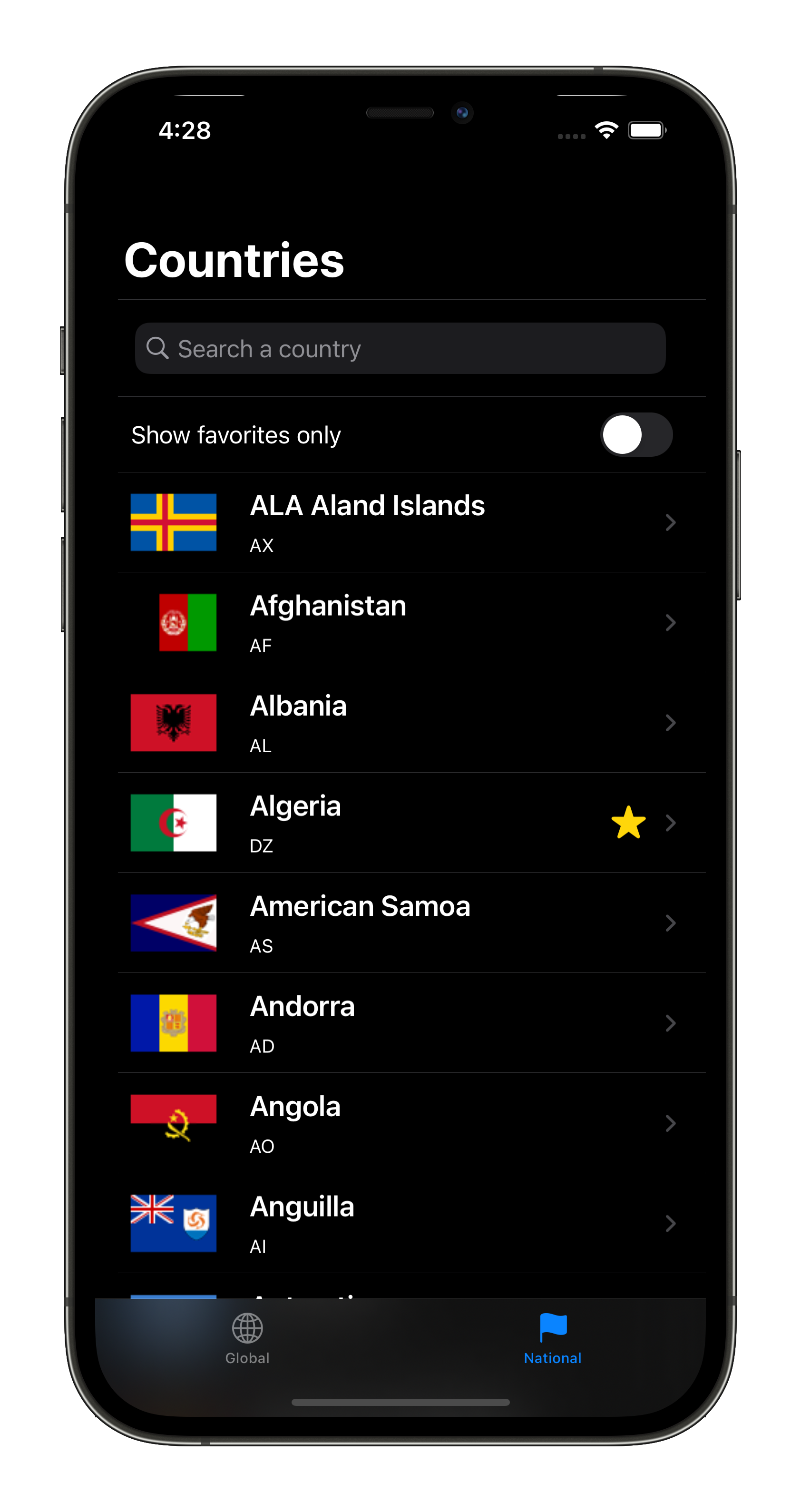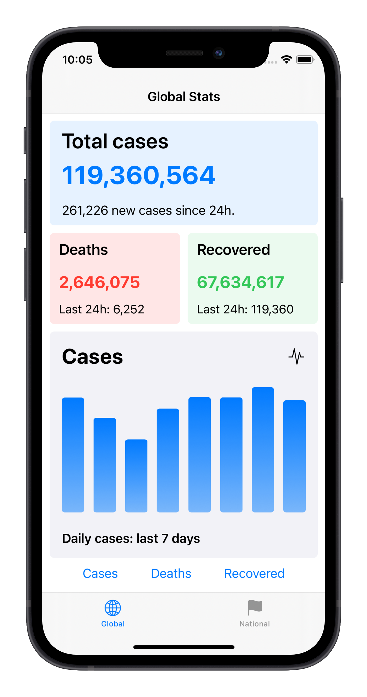 SupHealth Beautiful Covid-19 stats & tracking app for iOS, made with SwiftUI. Lots to love: Always up-to-date API Check stats by countries Beautiful interactive charts Save countries to favorites list