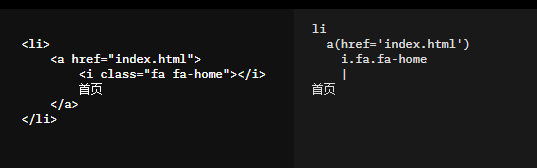 input > <li> <a href="index.html"> <i class="fa fa-home"></i> 首页 </a> </li> output li a(href='index.html') i.fa.fa-home | 首页
